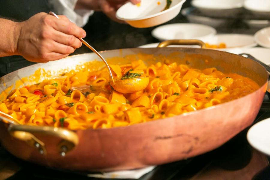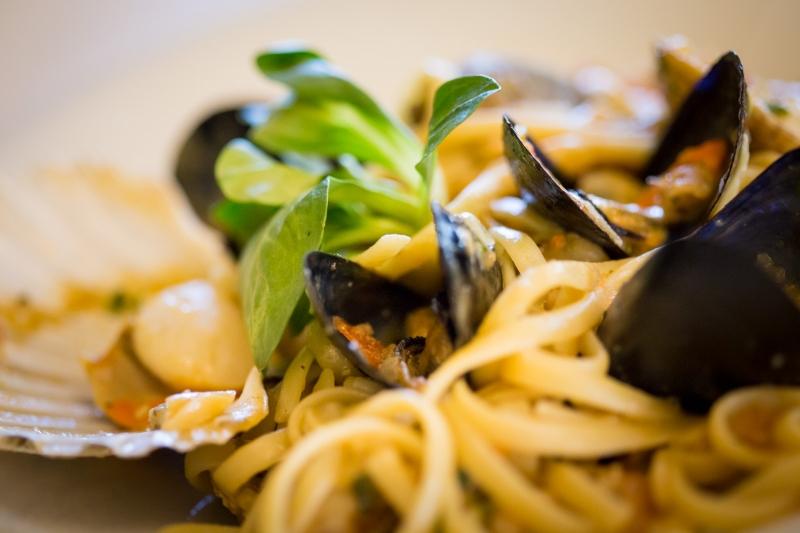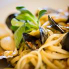Fish menu: Marinated sardines; Three types of tagliatelle (fresh homemade pasta with spinach, turmeric and cuttlefish ink) with prawns and squid; Mille Feuille cake; A glass of white wine