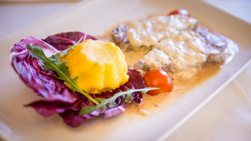 Meat menu: Autumn meat salad; Pork loin with porcini mushrooms in red wine and polenta; Tutti-Frutti cake; Red wine 0.25 and water