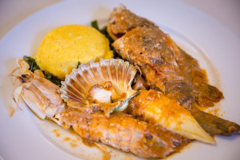Fish menu: Marinated sardines; Shrimps and clams alla busara "Štorija" with polenta; Homemade cake; A glass of white wine
