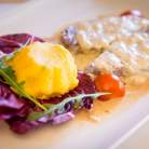 Meat menu: Feral-style roe deer basket (polenta basket with roe deer sauce); Feral kidney wrap (stuffed pork fillet in puff pastry); Homemade strudel Feral (dough, seasonal fruit, accompanying creams); 0.2 dl wine / beer / juice and water
