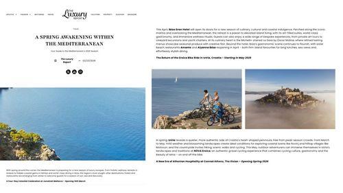 Britanski The Luxury Report objavio je sezonski pregled najatraktivnijih luksuznih destinacija Mediterana za proljeće i ljeto 2026., koji obuhvaća odabrane hotele, retreat koncepte, gastronomske adrese i iskustvene boravke u Grčkoj, Španjolskoj, Turskoj i Hrvatskoj. U kontekstu Hrvatske, Istra je predstavljena kao destinacija koja u proljetnim mjesecima otkriva svoju mirniju i autentičniju stranu, idealnu za aktivni odmor i istraživanje krajolika bez ljetnih gužvi. Posebno se ističe povratak NOVA Eroica Istria biciklističkog događanja u svibnju 2026., koji se opisuje kao spoj gravel kulture, gastronomije i prirodnih ljepota istarskog poluotoka.