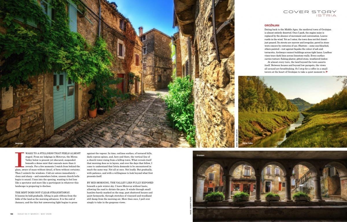 Pod naslovom Istria - The Beautiful Croatian Peninsula Brimming with History and Culture (Istra - prekrasni hrvatski poluotok prepun povijesti i kulture) Istra je pozicionirana kao destinacija snažnog identiteta, povijesne dubine i kulturne kohezije. Već sama naslovnica magazina, s fotografijom Završja, jasno smješta poluotok u središte uredničkog fokusa, dok reportaža započinje prikazom Motovuna.
