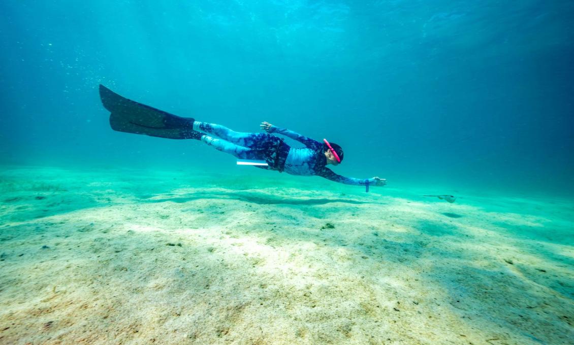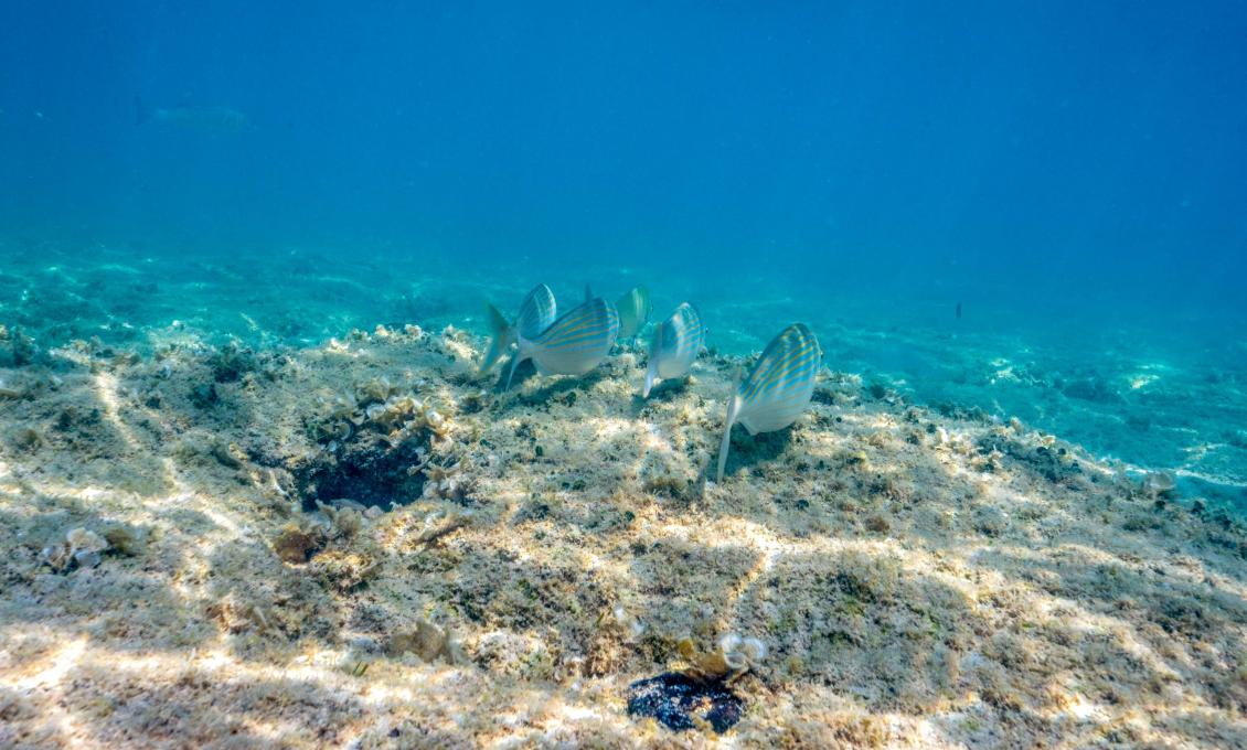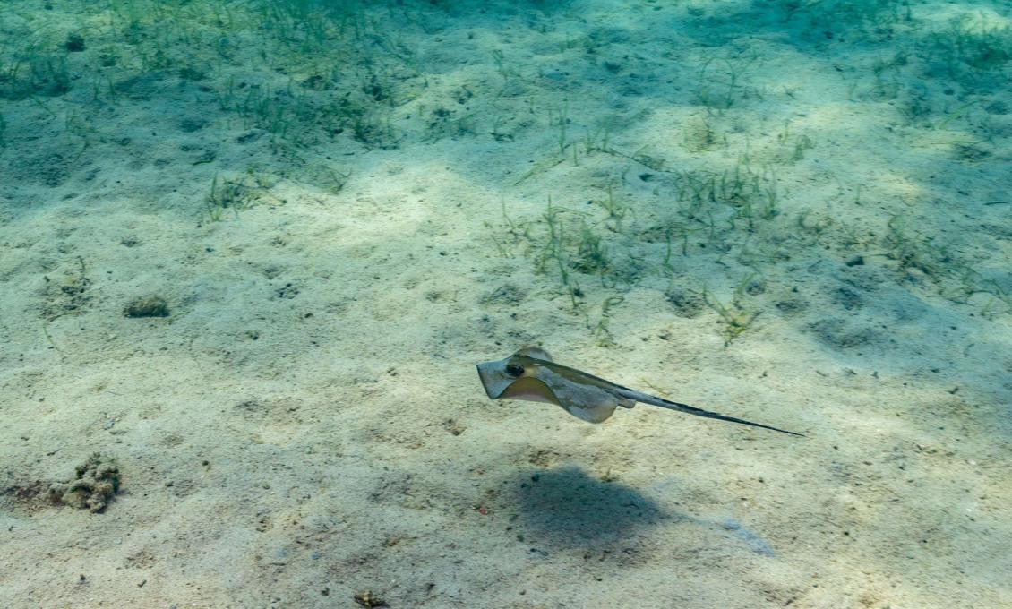 If you enjoy stirring up clouds of sand, curious sea bream, perhaps the most striking fish of all, will likely join you. With a strong head crowned with a golden mark between the eyes, they’re known as the “queen of fish.” You’ll also notice traces of digging in the sand—caused by a sand steenbras, which forage for food by burrowing, identifiable by their thin, transverse stripes. Similar marks may be left by young rays, which can be seen in the early morning, peacefully waiting for the first bathers to enchant them gliding just above the sand.