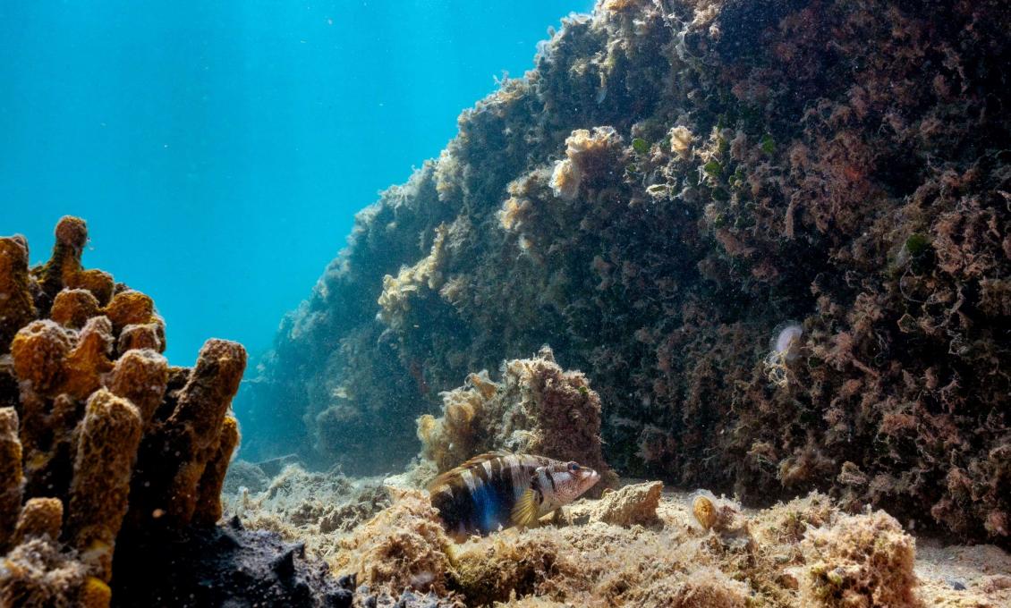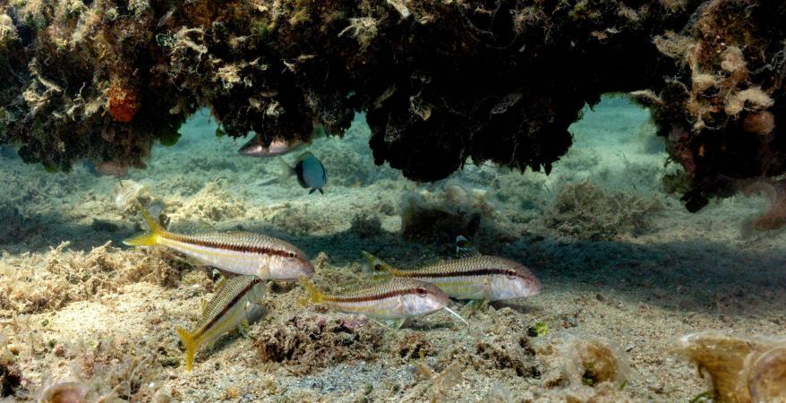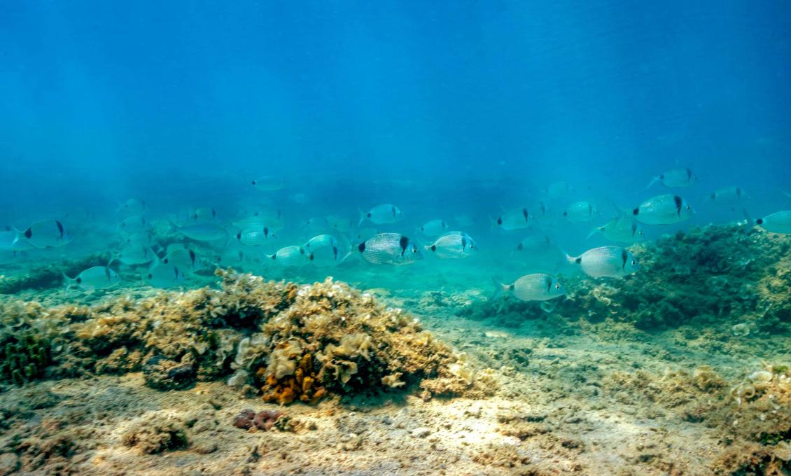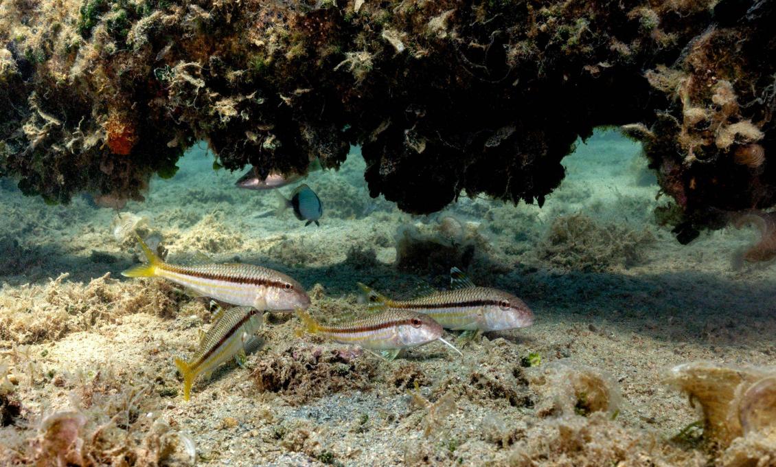 A school of mullets circles the bay, playing among the obstacles on the seabed. Here you can see particularly large specimens, which can be startling if you’re not expecting them. In the shallowest parts of the beach, large sea bass can also be found, which, like mullets, favour brackish water found at Saluga due to a small freshwater spring near the bistro. Sea bass have greenish backs, silver-white bellies, and a dark spot on their gill cover.