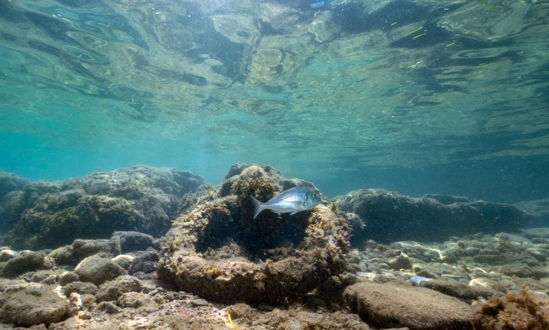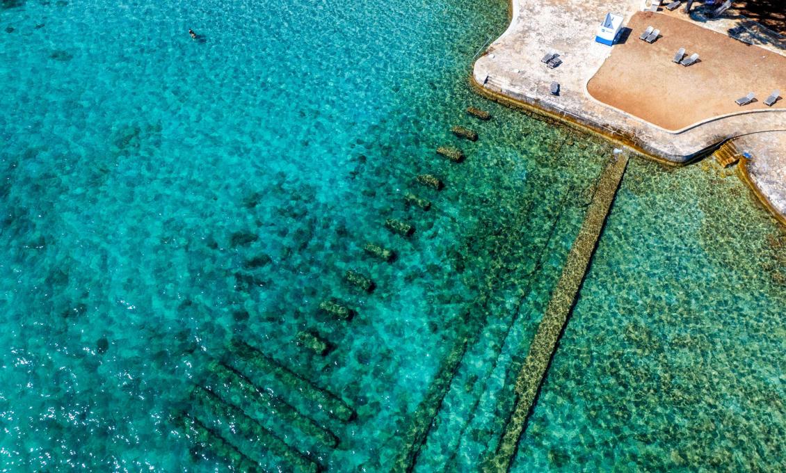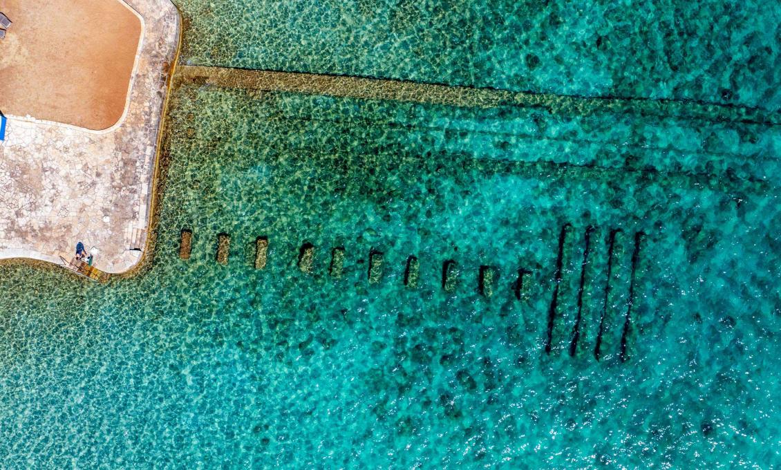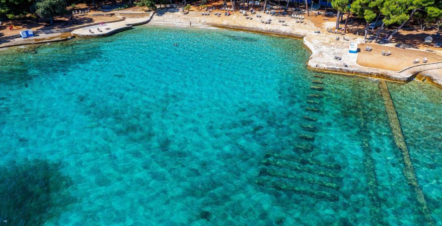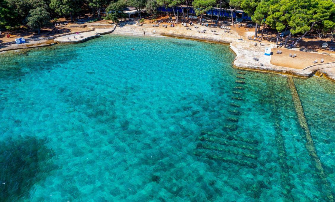 Wherever you enter the water, it’s easy to get oriented. In the center of the bay, the seabed is pure sand, while to the left, facing Fažana, is an area ideal for exploring. Here lie the concrete foundations of a wooden pier from the recent past and water pipes supplying Brijuni, following the original Kupelwieser pipeline route. An incredible variety of fish live and swim here!