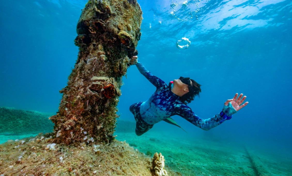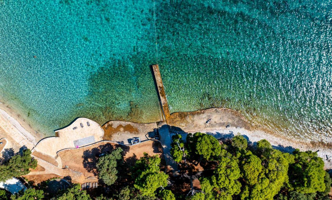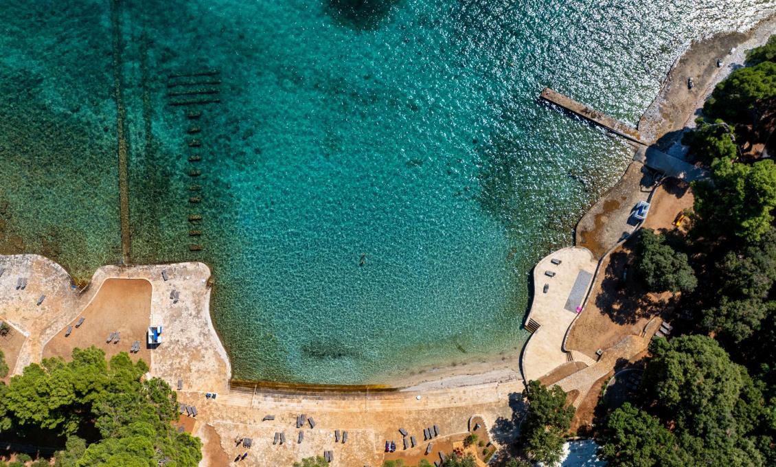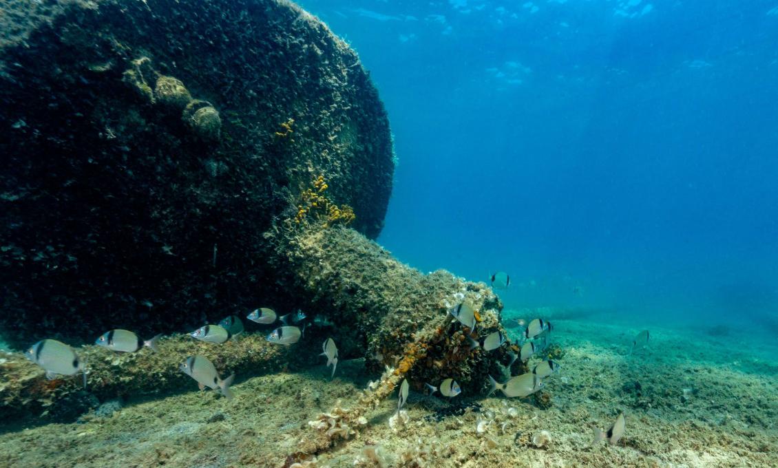 Wherever you enter the water, it’s easy to get oriented. In the center of the bay, the seabed is pure sand, while to the left, facing Fažana, is an area ideal for exploring. Here lie the concrete foundations of a wooden pier from the recent past and water pipes supplying Brijuni, following the original Kupelwieser pipeline route. An incredible variety of fish live and swim here!