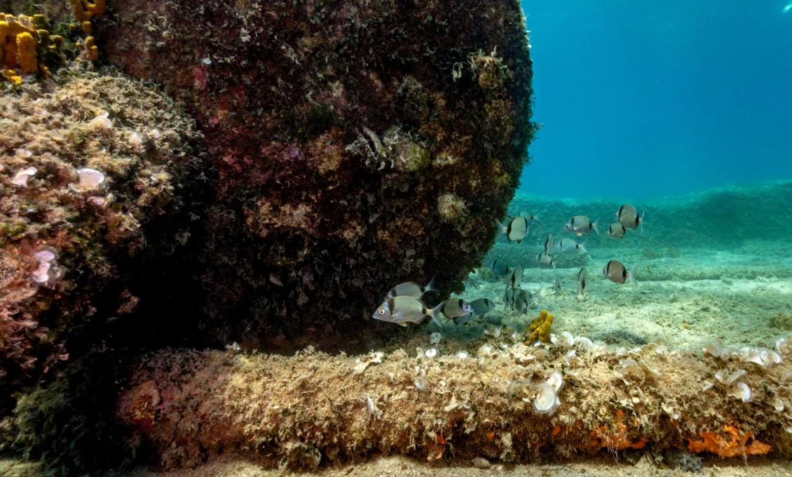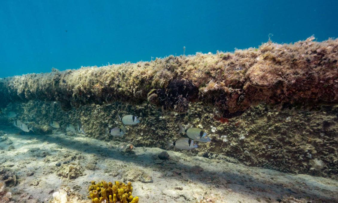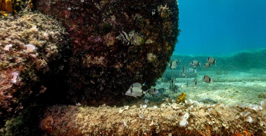 Here, a school of two-banded seabreams or locally known as "baraj," consisting of hundreds, gather around the square joints of the water pipes. You’ll recognize them easily by their distinct feature after which they were named - a black stripe resembling a collar behind the head, just like monks[i]. They are silvery with a golden sheen and a black stripe on their tail. When approached slowly, they will not flee but simply readjust slightly while maintaining formation, like a sea curtain. Around them are saddled seabreams (locally called "očada"), easily identifiable by their large eyes and a black-and-white ring around their tail.