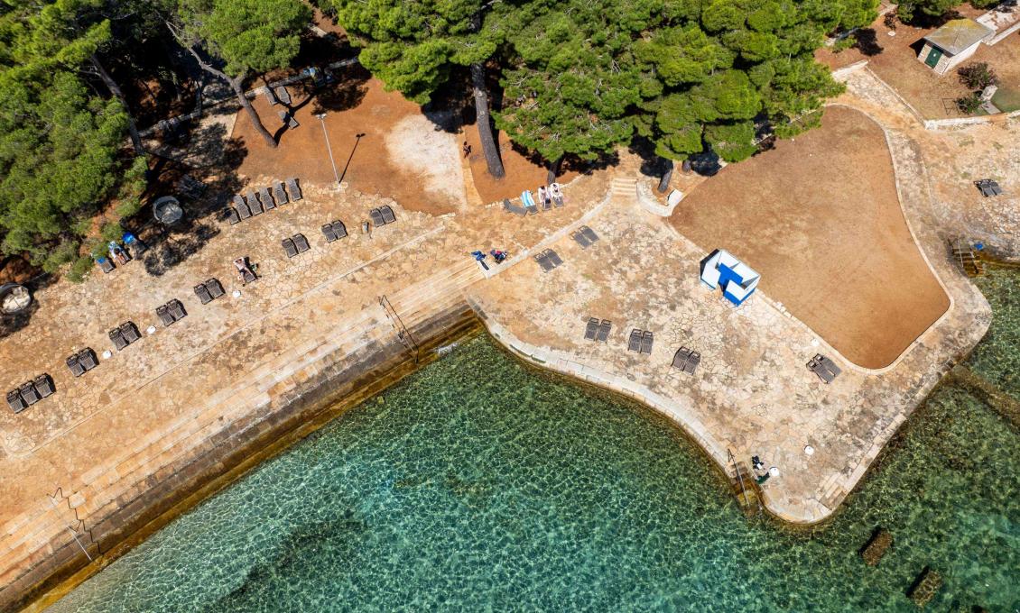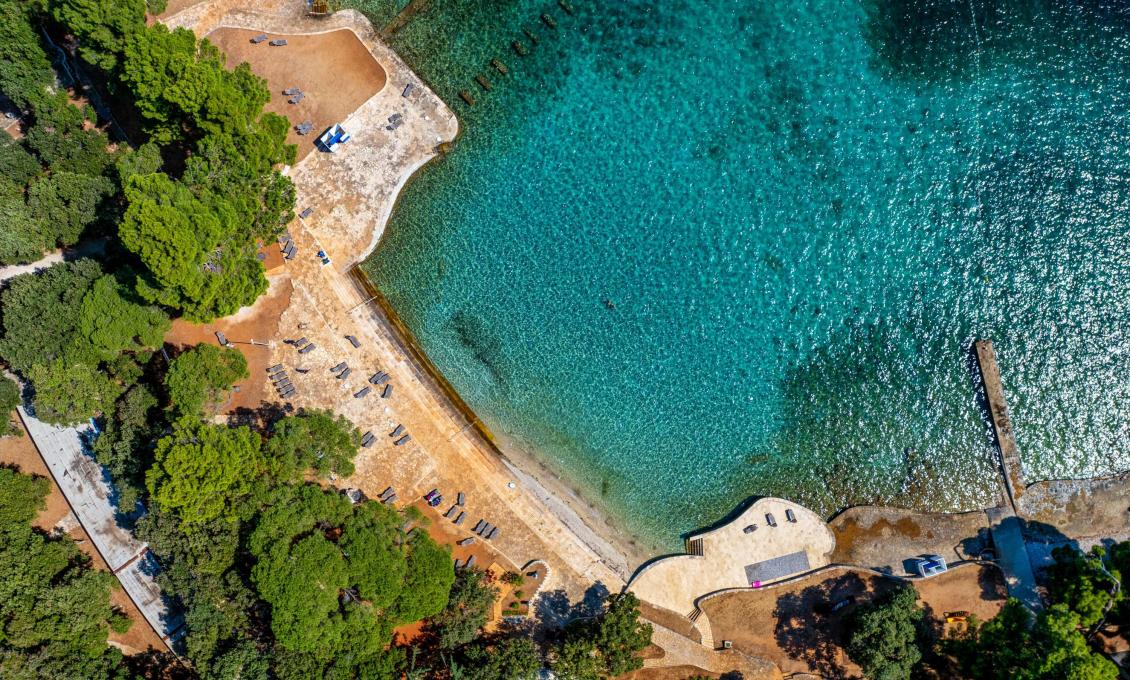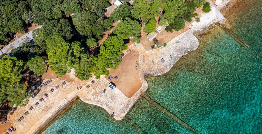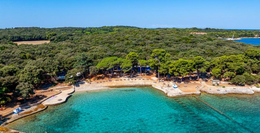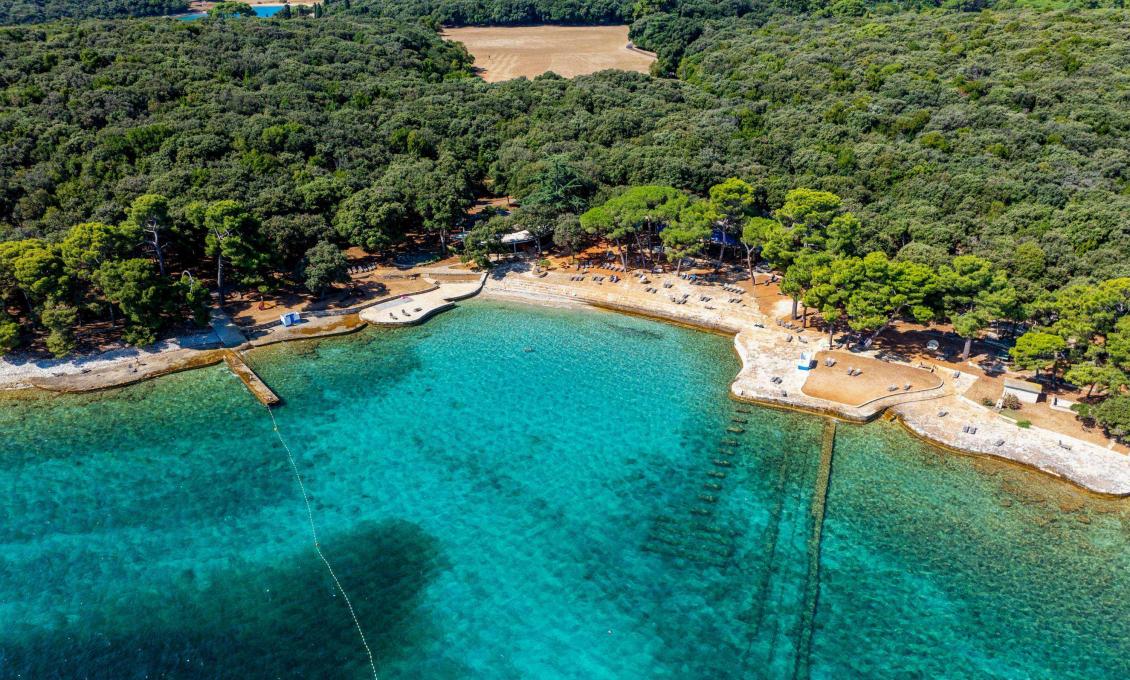 Today, Saluga Beach has a large paved sunbathing area with steps leading to a natural sandy seabed. In the shade of dense pine trees, visitors can relax on sun loungers or sun beds, enjoying a beautiful view of the turquoise sea and the Istrian coast.